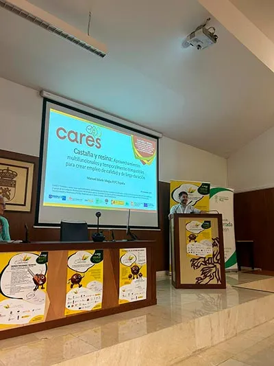 Una de las líneas de trabajo de PEFC es el proyecto CARES, a través del cual, Manuel Marín, técnico de Gestión forestal y proyectos innovadores de PEFC España, ha impartido la charla técnica “CARES. Castaña y resina como aprovechamiento multifuncional para impulsar la gestión forestal activa y el desarrollo rural en el noroeste peninsular”. Además, para promover la formación desde el proyecto, se realizó un taller demostrativo de poda de castaño en altura.